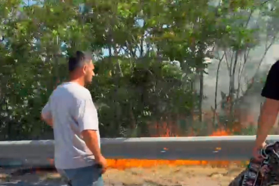 Otluk alandaki yangına yoldan geçen sürücüler, araçlarından çıkardıkları yangın söndürme tüpleriyle müdahale ederken, otoyol kenarına çıkan köylü çocuklar da, yangına müdahale etmek için araçlardan su istedi.