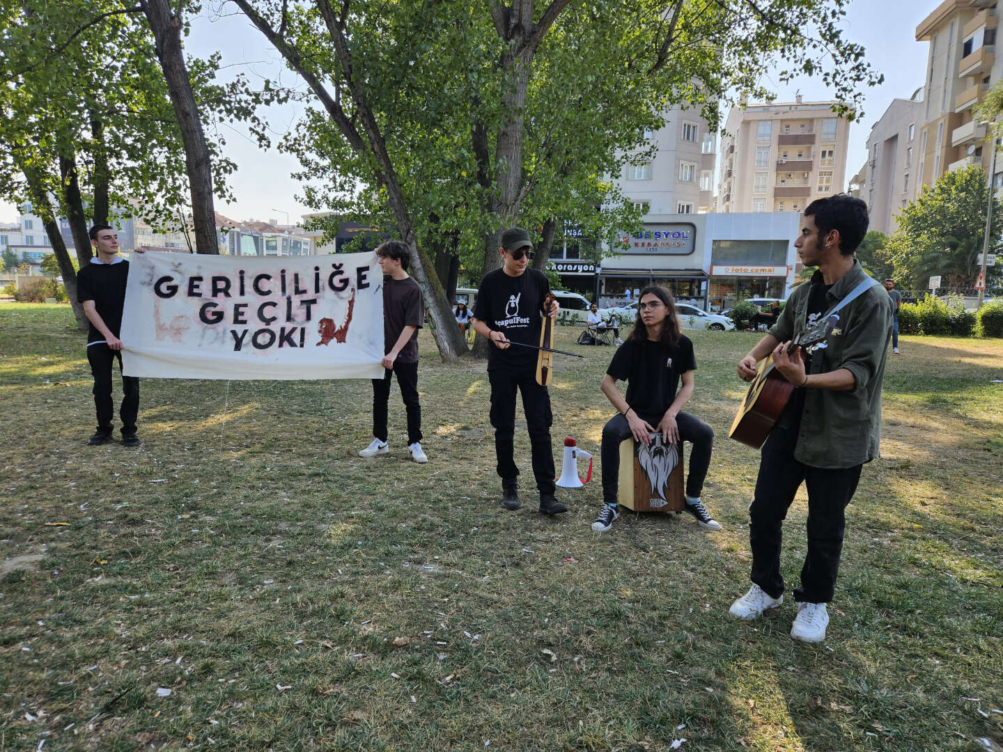 "Depremde toplanan paraların, ses çıkarılmayan taciz ve tecavüzlerin, 5'li çeteye çekilen peşkeşlerin, sırf karşı geldigi için vatandaşları vatan haini olarak yaftalayanların, kendi otel ve villarını yapabilmek için yakılan ormanların, rant uğruna kesilen ağaçların karşısında devrimci gençler olacaktır. Hükümet bu politakalarının devamında laikliğin son savunucuları, emir altına girmek yerine sorgulamayı unutmayan gençlere göz dikmiştir. Bugün ülkenin her yanındaki festivallere yasak gelirken, hükümet gençlerin ne yapmalarına karar verme cüretini gösterirken sessiz kalamazdık. Elimizden insanca yaşama hakkı alınmışken artık tek dayanaklarımız müzik ve sanattır."
