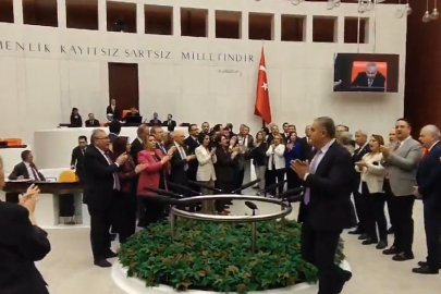 Genel Kurul'daki kürsünün etrafnıdan toplanan CHP'li miledtvekilleri alkışlarla kararı protesto etti.