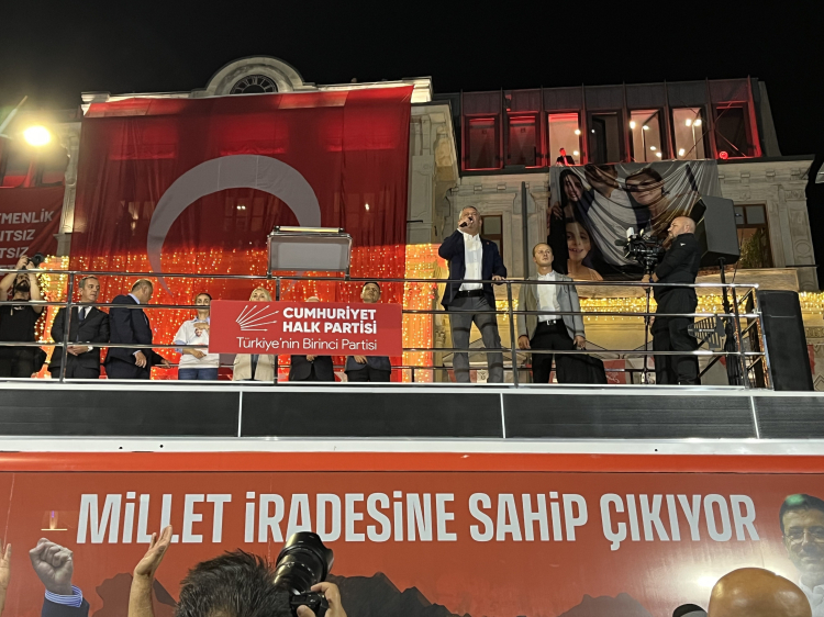 "Bu bir siyasetçinin, bir genel başkanın başarabileceği bir iş değildir. Bu, ancak sizin gibi yiğit insanların cesaret verdiğinde birimizin yapacağı bir iştir. O birimiz gücü kendinden değil, meydanlardan alıyor, haklılıktan alıyor, sizlerden alıyor. Bugüne kadar 10 milyon kişi meydanlarda Ekrem Başkan'a sahip çıktı, arkadaşlarımıza sahip çıktı, Eylemdir, ne zaman sonuç alırsa o gün bitecek. Buradan Erdoğan'a ve onun yargıdaki aparatlarına sesleniyorum. Bizi yıldıramazsınız. 9 dalga yaptınız, 99 dalga da yapsanız buradayız, ayaktayız, eylemdeyiz. Bu ilçede yapılan seçimler hep tarihi sonuçlar doğurmuştur. Bu ilçede Recep Tayyip Erdoğan milletvekili adayı olmuştur, kazanamamıştır. Beyoğlu Belediye Başkan adayı olmuştur, kazanamamıştır. Ama dedesi Beyoğlu Belediyesi'nde süpürgeci olan, babası Beyoğlu Belediyesi'nde şoför olan, kendisi Beyoğlu Belediyesi'nin garajlarında büyüyen İnan'ımız yüzde 50 oyla belediye başkanı olmuştur.