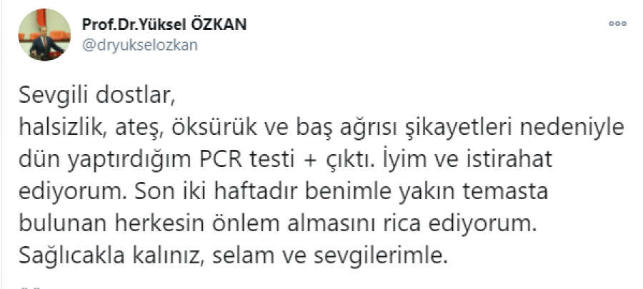 Özkan, sosyal medya hesabından yaptığı paylaşımda, halsizlik, yüksek ateş, öksürük ve baş ağrısı şikayetleri nedeniyle dün test yaptırdığını bildirdi.