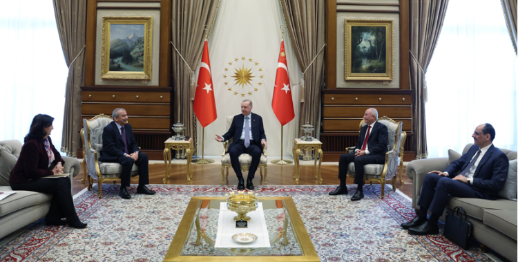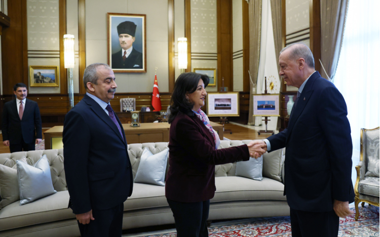 Cumhurbaşkanı Tayyip Erdoğan DEM Parti İmralı Heyeti ile Cumhurbaşkanlığı Külliyesi'nde biraraya geldi. Görüşme, yaklaşık 1,5 saat sürdü.