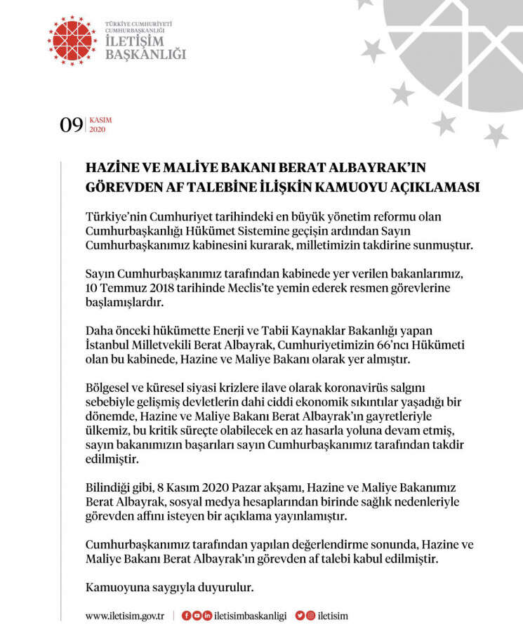 Cumhurbaşkanlığı İletişim Başkanlığı'ndan Berat Albayrak'ın Hazine ve Maliye Bakanlığı'ndan istifasına ilişkin 27 saat sonra açıklama geldi. Açıklamada, "Hazine ve Maliye Bakanı Berat Albayrak'ın görevden af talebi kabul edilmiştir" denildi.