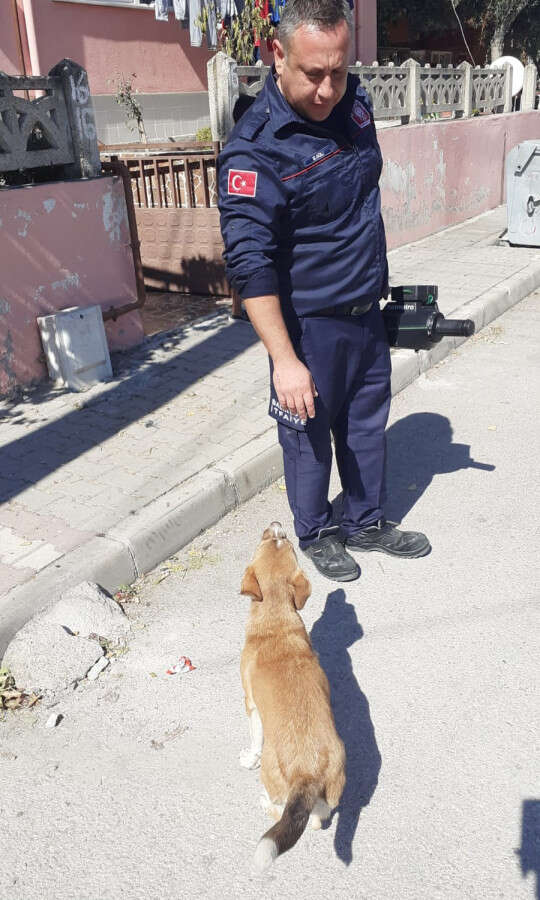 Sokak köpeği kendisini sıkıştığı demir kapıdan kurtaran itfaiye görevlisine yaklaşarak sevgi gösterisinde bulundu