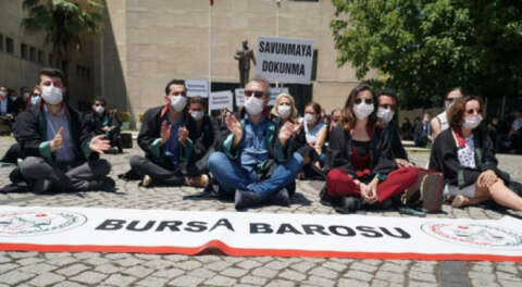 Bursa Barosu üyesi avukatlar bugün de öğle saatinde Adalet Sarayı bahçesinde toplanarak sloganlarla yasa teklifini protesto etti.