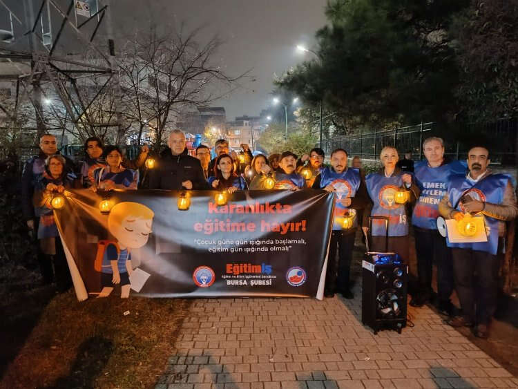 Eğitim İş Bursa Şubesi, kalıcı yaz saati uygulamasını karanlıkta protesto etti. Şube Başkanı Yeliz Toy, "Çocuk güne, gün ışığında başlamalı, eğitim gün ışığında olmalı" dedi.