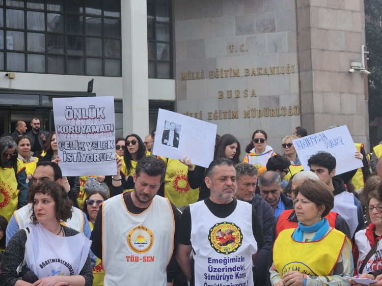 Şanlıurfa ve Kahramanmaraş'taki okul saldırıları sonrası iş bırakan eğitimciler, Bursa İl Milli Eğitim Müdürlüğü önünde toplandı. Bakan Yusuf Tekin'i protesto eden sendikalar, okul güvenliği ve bilimsel eğitim talebiyle "Bakan istifa" dedi.
