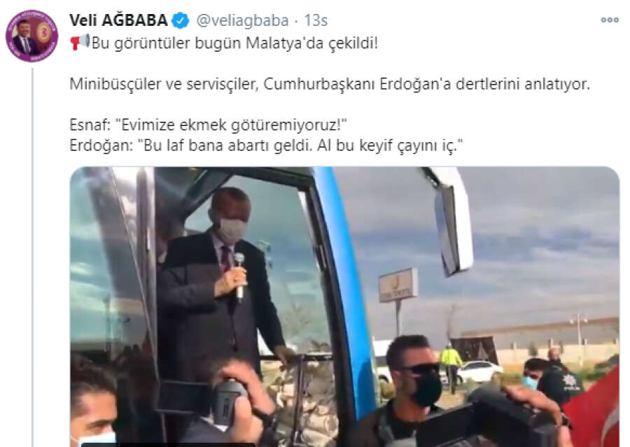 CHP Genel Başkan Yardımcısı Veli Ağbaba, Twitter hesabından, bugün toplu açılış töreni için Malatya'ya giden Cumhurbaşkanı ve AKP Genel Başkanı Recep Tayyip Erdoğan'ın şehirdeki esnafla diyaloğunun görüntülerini paylaştı. Ağbaba'nın paylaştığı görüntülerde Erdoğan, "Evimize ekmek götüremiyoruz" diyen bir esnafa, "Bu bana abartılı geldi" diye yanıt verdi. Vatandaşlara çay dağıtan Erdoğan, "Al bu keyif çayını iç" dedi.