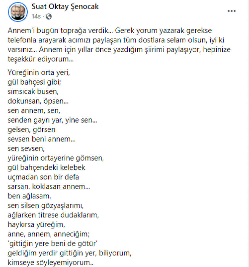Gazeteci, tiyatro sanatçısı ve yönetmen Suat Oktay Şenocak, sosyal medya hesabından annesinin vefatı dolayısıyla kendisine başsağlığı dileyenlere teşekkür ederken, annesine yazdığı duygusal bir şiiri de paylaştı.