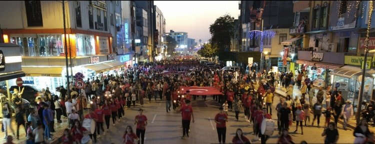 Hatay'ın Dörtyol ilçesinde kutlamalar kapsamında fener alayı yürüyüşü düzenlendi. Meşaleler ve ellerinde bayraklarla bir araya gelen vatandaşlar Çaylı Caddesi'nden Atatürk Anıtı'na kadar yürüdü.