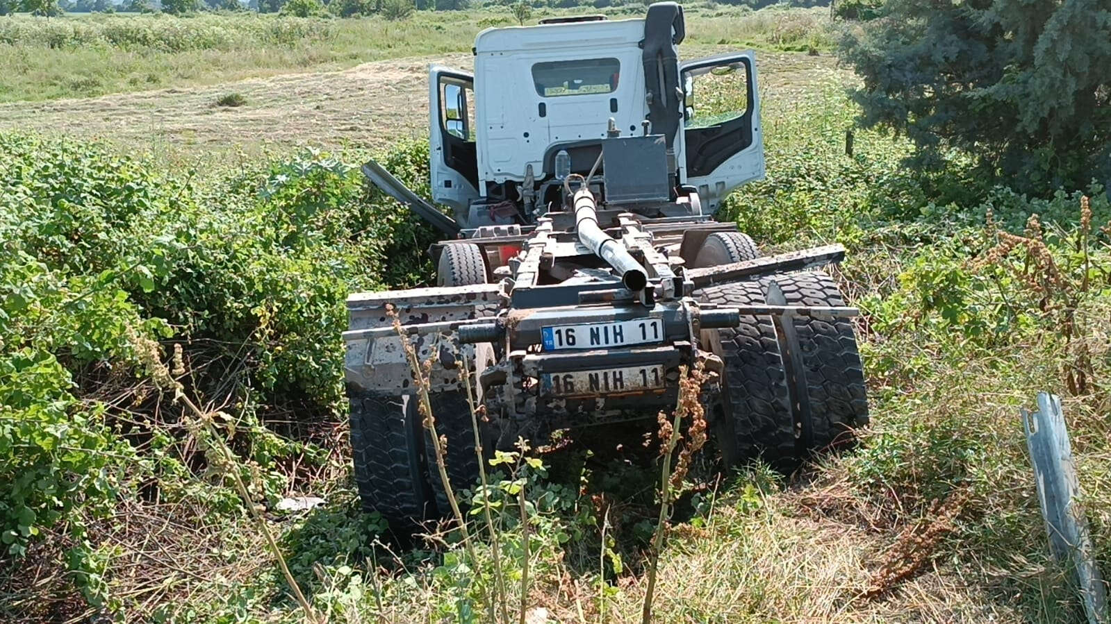 Bursa'nın İnegöl ilçesinde açık kalan damperi köprüye takılarak kopan tır, yolun karşı şeridini aşıp şarampole devrildi.