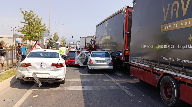 Bursa'nın İnegöl ilçesinde meydana gelen kazada otomobil, kırmızı ışıkta bekleyen 2 otomobil ile 1 tıra çarptı; 2 kişi yaralandı.