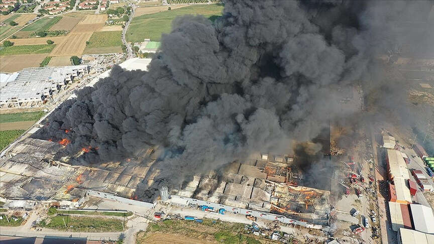 Ekipler, karadan ve havadan müdahaleyle, tek çatı altındaki 6 fabrikada etkili olan yangını kontrol altına almak için çalışmasını sürdürüyor.