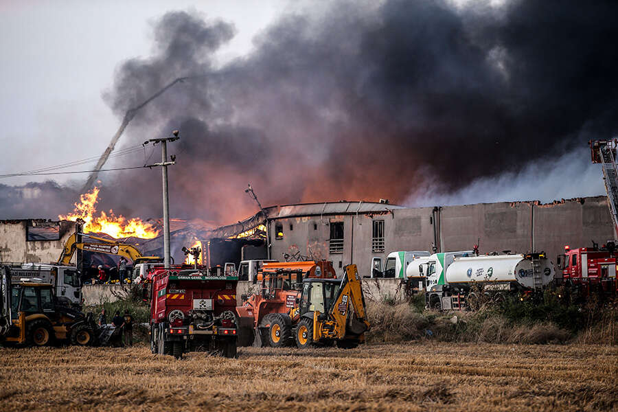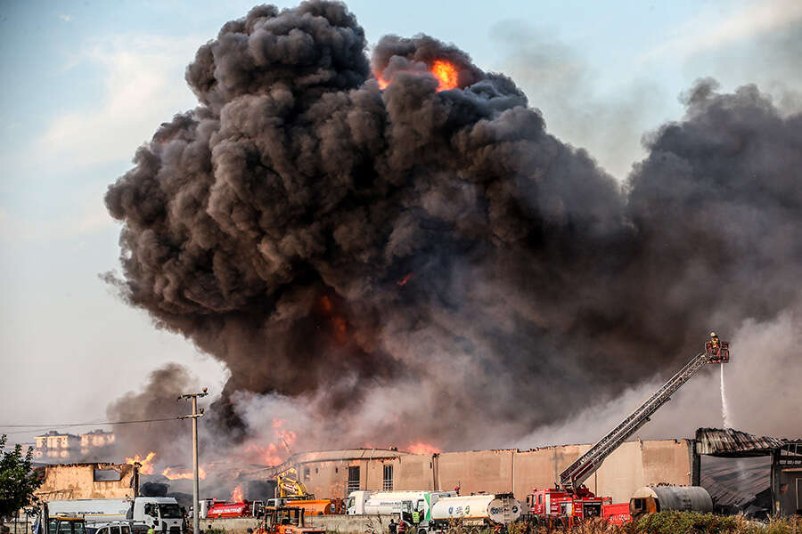Bölgede, ekiplerin müdahalesi sırasında zaman zaman patlamalar yaşanırken, civardaki fabrikalar da tedbiren tahliye edildi.