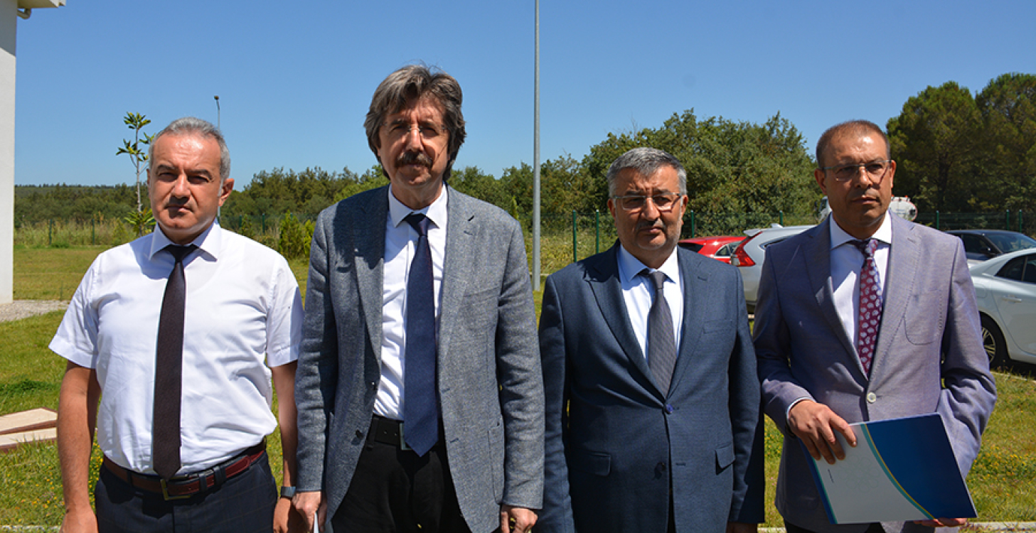 BUÜ Rektörü Prof. Dr. Ferudun Yılmaz (soldan ikinci), kampüste yangınla ilgili açıklamalarda bulundu