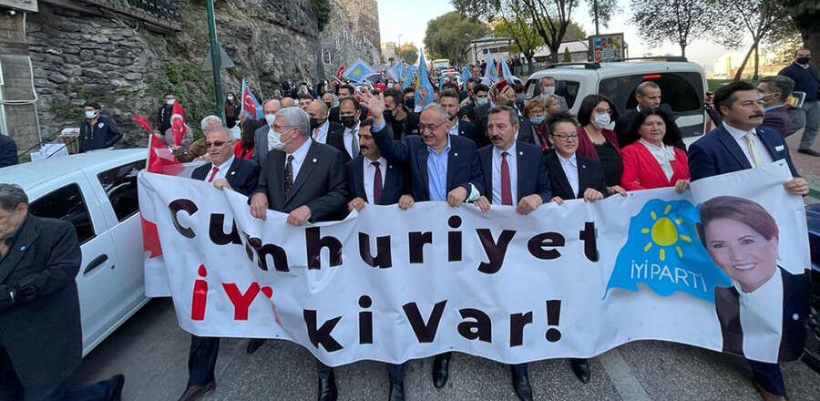 İYİ Parti Bursa İl Teşkilatı'nın Tophane'de, Osman ve Orhangazi Türbeleri önünden başlayıp Heykel Atatürk Anıtı'na çelenk sunumuyla devam eden 29 Ekim Cumhuriyet Yürüyüşü, tarihi Büyükşehir Belediye binasının önündeki mitingle son buldu.
