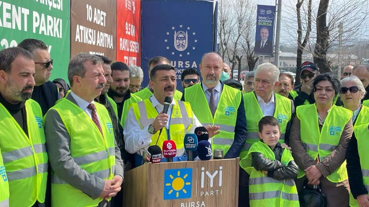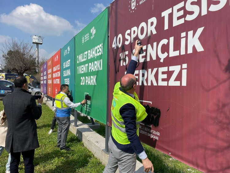 İYİ Parti Bursa Büyükşehir Belediye Başkan Adayı Selçuk Türkoğlu, Bursa İl Başkanı Mehmet Hasanoğlu ve partililer, haklarında toplatılma kararı olan afişlerin önünde protesto düzenledi. Yasağa rağmen kaldırılmayan afişlerin üzerine "Yalan" yazıldı.