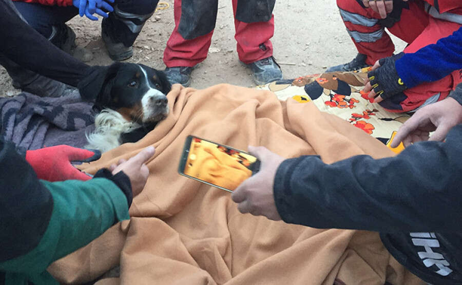 İzmir'deki depremde çöken Rıza Bey Apartmanı enkazından "Ares" adlı köpek 65 saat sonra sağ salim çıkarıldı.
