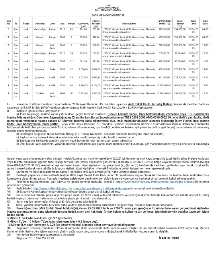 Milli Emlak tarafından İznik'in Mahmudiye, Çiçekli, Çampınar, Şerefiye ve Yörükler mahallelerinde yer alan 9 adet taşınmaz satışa çıkarılmasına ilişkin, "Milli Emlak, Türkiye'nin her yerinde yer satabilir. Belediyenin sattığı yok. Belediyenin avantajı, Milli Emlak'ın yer satışından belli bir oranı belediyelere verilir. Göle uzak yerlerde bu satışlar. İznik Gölü'ne en yakın yer en az 10 kilometredir. Diğerlerinin hepsi dağlarda. Şahıs talepleriyle ilgili bu satışlar" diye konuştu. Satışa çıkacak hazine taşınmazları arasında tarım arazileri, çalılık, bahçe ve tarla bulunuyor.