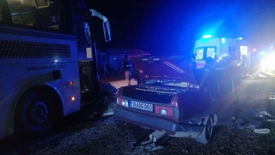 Kurşunlu Mahallesi yolunda Oğuzhan Sönmez (22) yönetimindeki 16 ADG 060 plakalı otomobil, kontrolden çıkarak karşı şeride geçip Onur Gürsoy'un (37) kullandığı 16 S 6195 plakalı servis otobüsüyle çarpışmıştı. Çarpışmanın etkisiyle ikiye bölünen otomobilde bulunan Fatih Akyol (22) olay yerinde, sürücü Sönmez ise kaldırıldığı İnegöl Devlet Hastanesinde yaşamını yitirmişti.