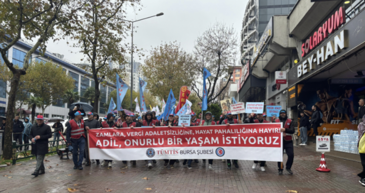 KESK, TBMM'de görüşülen 2026 bütçesini protesto için Bursa'da yürüyüş düzenledi. Bütçenin yoksulluk ve adaletsizlik getirdiğini savunan KESK, vergi yükünün halka, kazancın ise patronlara aktarıldığını belirtti.