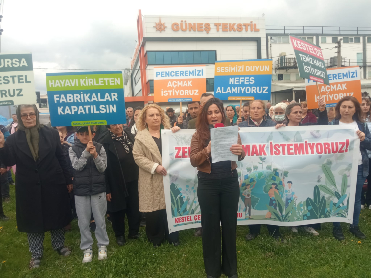 "Bugün burada, Kestel’in kalbinde, yaşam alanlarımızın tam ortasında faaliyet gösteren Güneş Tekstil’in sebep olduğu çevre katliamına ve insan sağlığını hiçe sayan uygulamalarına “Dur!” demek için toplanmış bulunuyoruz.