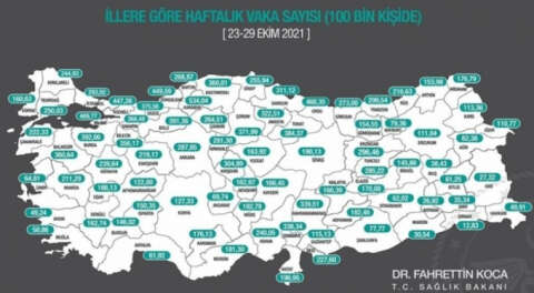 Bakan Koca'nın, sosyal medya hesabından paylaştığı Türkiye haritasında yer alan verilere göre, 23-29 Ekim'de her 100 bin kişide Kovid-19 vaka sayısı İstanbul'da 293,02, Ankara'da 287,85, İzmir'de 64,81, Bursa'da 392,06 oldu.
