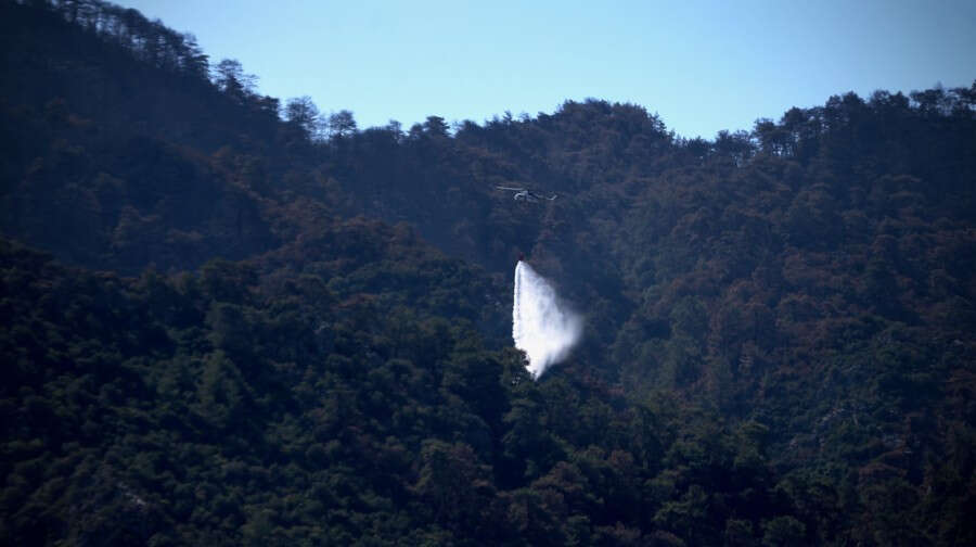 Yanmış ağaçlar, iş makinelerinin açtığı çukurlar, sarp arazilerde açılan yollar ile alevlerden geriye kalan izler, yangının otel ve yerleşim bölgesine ulaşmaması için gösterilen çabayı net şekilde ortaya koyuyor.