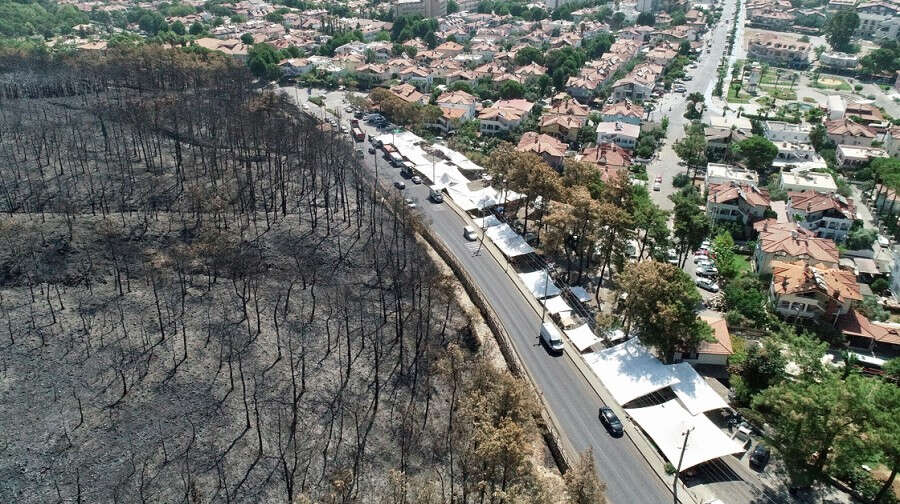Muğla'nın Marmaris ilçesinde, yanan alanlar havadan görüntülenirken, alevlerden geriye kalan izler yangının otel ve yerleşim bölgesine ulaşmaması için gösterilen çabayı net şekilde ortaya koyuyor.