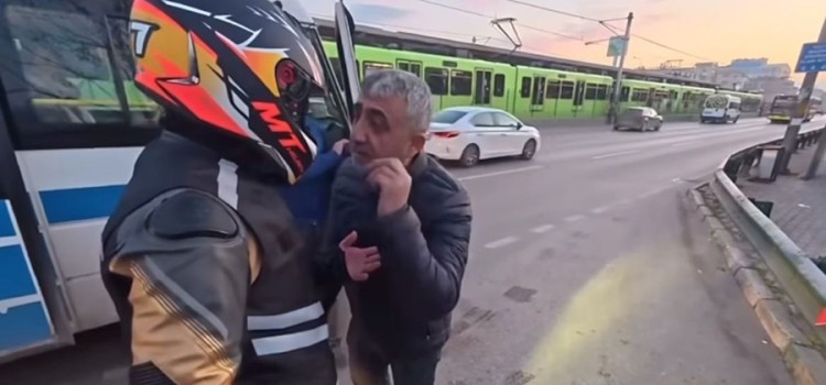 Bursa'da seyir halindeki motosikletli, direksiyonu önüne kırdığını iddia ettiği minibüs şoförüne 'lan' diye hitap edince ortalık karıştı. Yaşanan kavgayı çevredeki vatandaşlar ayırdı.