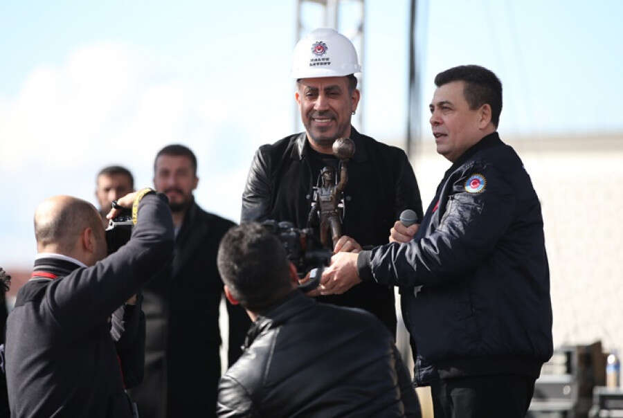 Daha sonra Genel Başkan Atalay, Haluk Levent'e işçi bareti ve tablo hediye etti.