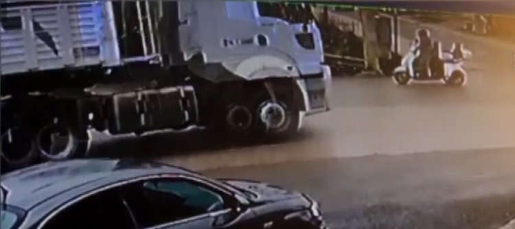 Tırın motosikletli sürücünün geçişinin hemen ardından devrildiği anlar güvenlik kamerası görüntülerine yansıdı.