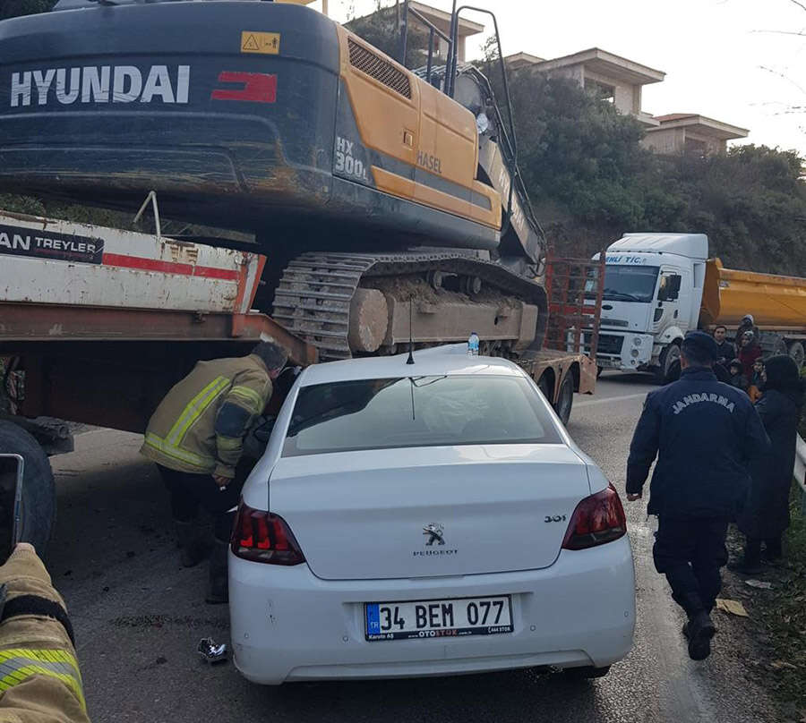 Bursa'nın Mudanya ilçesinde, iş makinesi yüklü tırla çarpışan otomobilin sürücüsü ve araçta bulunan 2 kişi yaralandı.