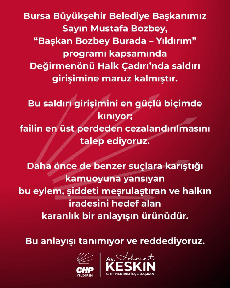 CHP Bursa İl Başkanlığından yapılan paylaşımda, "Bursa Büyükşehir Belediye Başkanımız #MustafaBozbey’i hedef alan alçakça saldırı girişimini kınıyoruz. Her hafta bir ilçemizde halk buluşmaları gerçekleştiren Büyükşehir Belediye Başkanımız Mustafa Bozbey'e yönelik bu saldırı girişimi aynı zamanda sosyal ve halkçı belediyeciliğe de yapılan bir saldırıdır. Hiçbir saldırı bizi yolumuzdan döndüremeyecektir! Büyükşehir Belediye Başkanımız Mustafa Bozbey’e ve çalışma arkadaşlarına geçmiş olsun dileklerimizi iletiyoruz" denildi.