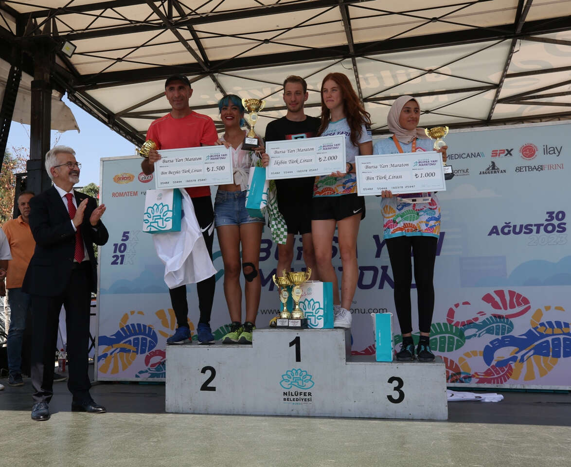 Zafer Bayramı gururunu sporla buluşturan Nilüfer Bursa Yarı Maratonu öğle saatlerinde tamamlandı ve ardından her kategoride dereceye girenlere ödülleri verildi. Maratonda dereceye girenlere ödüllerini Nilüfer Belediye Başkanı Turgay Erdem, Nilüfer Belediye Başkan Yardımcısı Dr. Sibel Özer, Nilüfer Belediyesi Gençlik ve Spor Hizmetleri Müdürü Hülya Akgül ile Nilüfer Belediyesi Basın Yayın ve Halkla İlişkiler Müdürü Servet Set verdi.