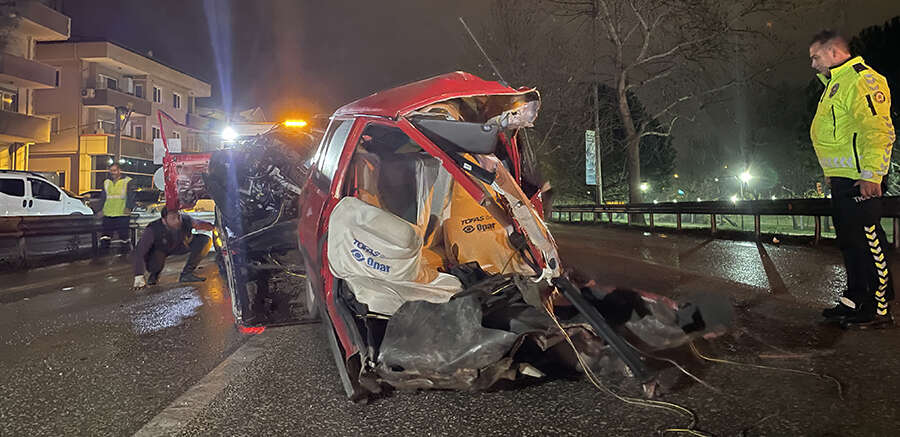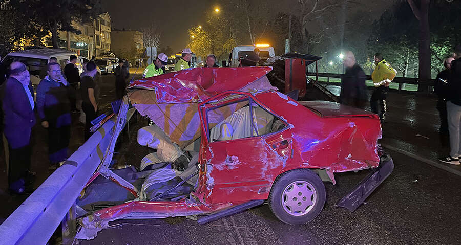 Bursa'nın Osmangazi ilçesinde toplu taşıma aracına ve demir bariyerlere çarpan otomobil ikiye bölündü. Kazada otomobilin sürücüsü yaşamını yitirdi.