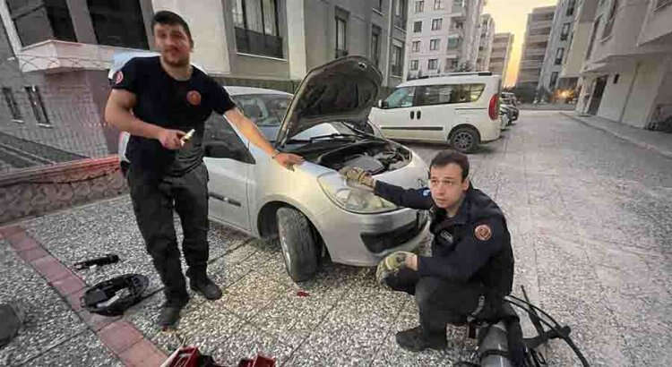 Adrese gelen itfaiye ekibi, sıkıştığı yerde doğum yaptığı belirlenen kedinin yavrusunu yaklaşık bir saatlik çalışmayla bulunduğu yerden çıkardı. Ekipler, sıkışan anneyi kurtaramayınca otomobil tamircisi çağırıldı.