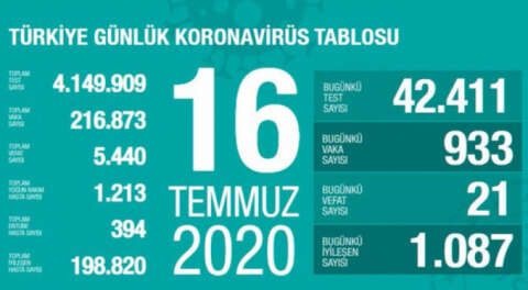 Sağlık Bakanlığının internet sitesinde yer alan ve Bakan Fahrettin Koca'nın da Twitter'dan paylaştığı "Türkiye Günlük Koronavirüs Tablosu"nun güncel verilerine göre, bugün 42 bin 411 test yapıldı, 933 kişiye Kovid-19 tanısı konuldu. Son 24 saatte 21 hasta vefat etti, 1087 kişi iyileşti.