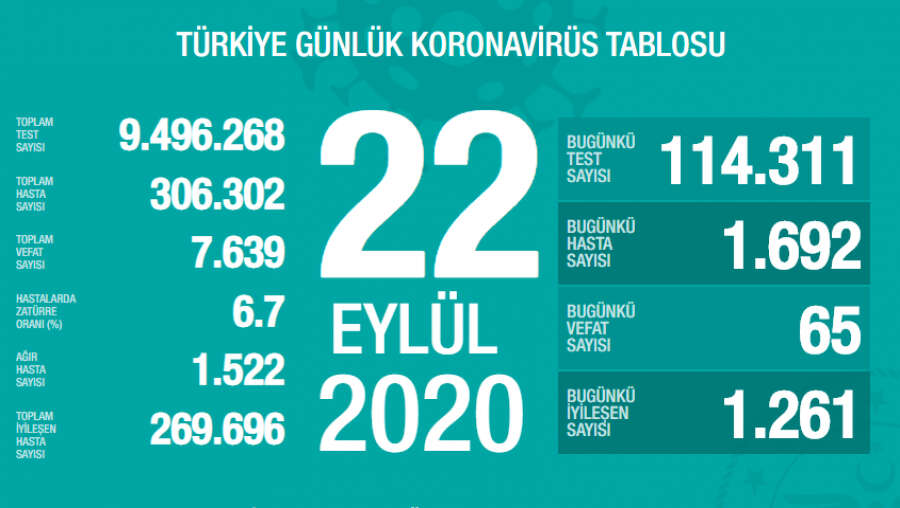 Türkiye'de son 24 saatte 114 bin 311 Kovid-19 testi yapıldı, 1692 kişiye hastalık tanısı konuldu, 65 kişi Kovid-19 nedeniyle hayatını kaybetti, ağır hasta sayısı 1522 oldu.