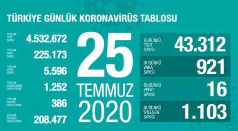Sağlık Bakanlığının internet sitesinde yer alan ve Bakan Fahrettin Koca'nın da Twitter'dan paylaştığı "Türkiye Günlük Koronavirüs Tablosu"nun güncel verilerine göre, bugün 43 bin 312 test yapıldı, 921 kişiye Kovid-19 tanısı konuldu. Son 24 saatte 16 hasta vefat etti, 1103 kişi iyileşti.