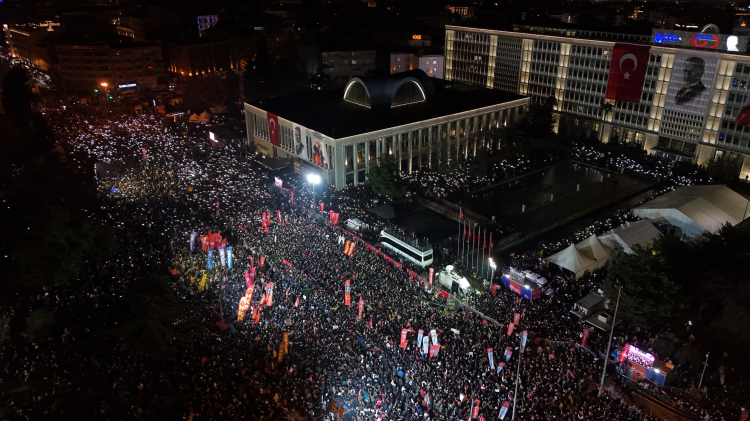 “Siz, evlerinizden çıkıp buraya gelmek istediğinizde, dört gün önce Erdoğan'ın talimatı, valilik kararıyla emniyet, üç kişinin bir araya gelip toplanmasını, gösteri yapmasını, miting yapmasını yarına kadar yasaklamıştı. O kararın ardından buraya gelen bütün yollar, Haliç'in üstündeki köprüleri kaldırdılar. Buraya gelen tüm viyadükler, tüm yollar kapatıldığı halde, ilk gün 110-120 bin kişiyle, ikinci gece 210-220 bin kişiyle, dün akşam, 220 bin dedik. Drone görüntülerini görünce neye uğradığımızı biz de şaşırdık. Gözün gördüğü yerde 550 bin kişi vardı. Ve buralara yaklaşamıyorlardı. Bugün, 550 bin kişiyle göz göze, Tarihi Yarımada bağlantı yollarıyla birlikte 1 milyon kişi gönül gönüleyiz.”