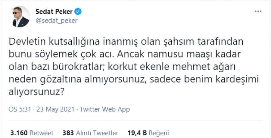 Kardeşinin gözaltına alınmasından sonra Twitter hesabından paylaşımda bulunan Sedat Peker, "Devletin kutsallığına inanmış olan şahsım tarafından bunu söylemek çok acı. Ancak namusu maaşı kadar olan bazı bürokratlar; Korkut Eken'le Mehmet Ağar'ı neden gözaltına almıyorsunuz, sadece benim kardeşimi alıyorsunuz?" dedi.