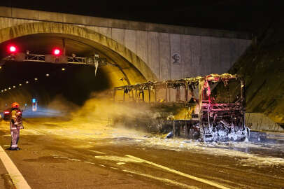 İstanbul-İzmir Otoyolunda Kocaeli'den Bergama'ya hareket eden Mürsel Duran yönetimindeki 41 ACR 055 yolcu otobüsü, Orhangazi Tüneli girişinde henüz belirlenemeyen nedenle alev aldı.