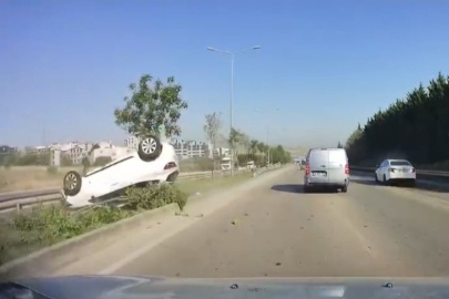 Bursa'nın Nilüfer ilçesinde kontrolden çıkan otomobil, bariyerleri aşarak ters yöne geçti. Takla atan araçta bulunan karı-koca kazayı yara almadan atlattı.