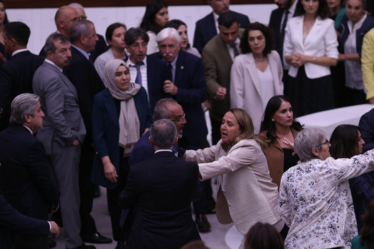 Çıkan kavgada DEM Partili Gülistan Kılıç Koçyiğit'in kaşı yarıldı ve yerler kanlandı, CHP'li Okan Konuralp de yaralandı.