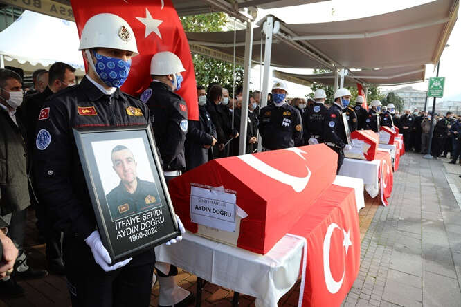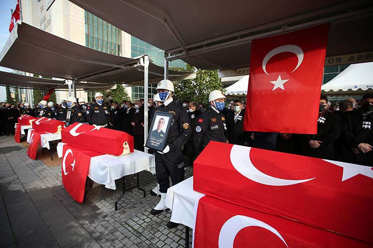İtfaiye çavuşu İsmail Kaya, itfaiye eri Sinan Amil, destek personeli Aydın Doğru ve Yunus Akşit'in cenazeleri, Türk bayrağına sarılı tabutlarda, helallik alınmak üzere belediyesinin bahçesine getirildi.