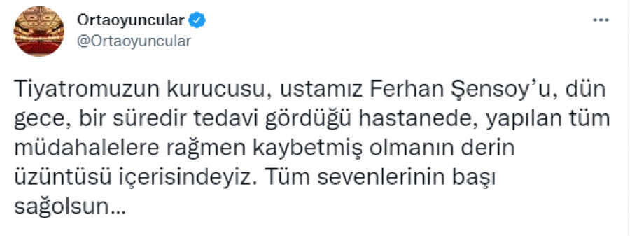 Ortaoyuncular sahnesinin Twitter hesabından yapılan paylaşımda, "Tiyatromuzun kurucusu, ustamız Ferhan Şensoy'u, dün gece, bir süredir tedavi gördüğü hastanede, yapılan tüm müdahalelere rağmen kaybetmiş olmanın derin üzüntüsü içerisindeyiz. Tüm sevenlerinin başı sağolsun" denildi.