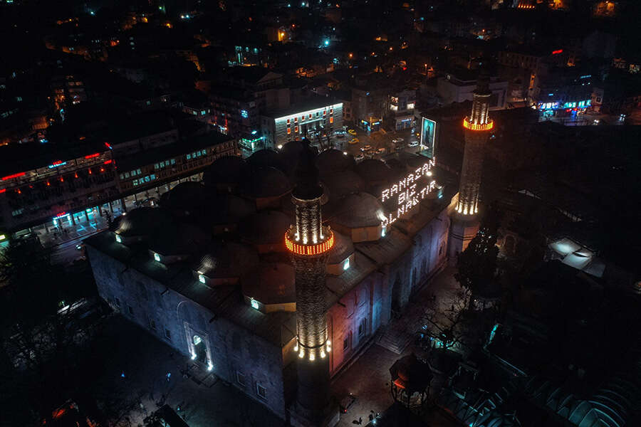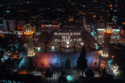 Ramazan ayının başlaması nedeniyle Bursa'daki tarihi Ulu Cami'nin minareleri arasına "Ramazan biz olmaktır" yazılı mahya asıldı.