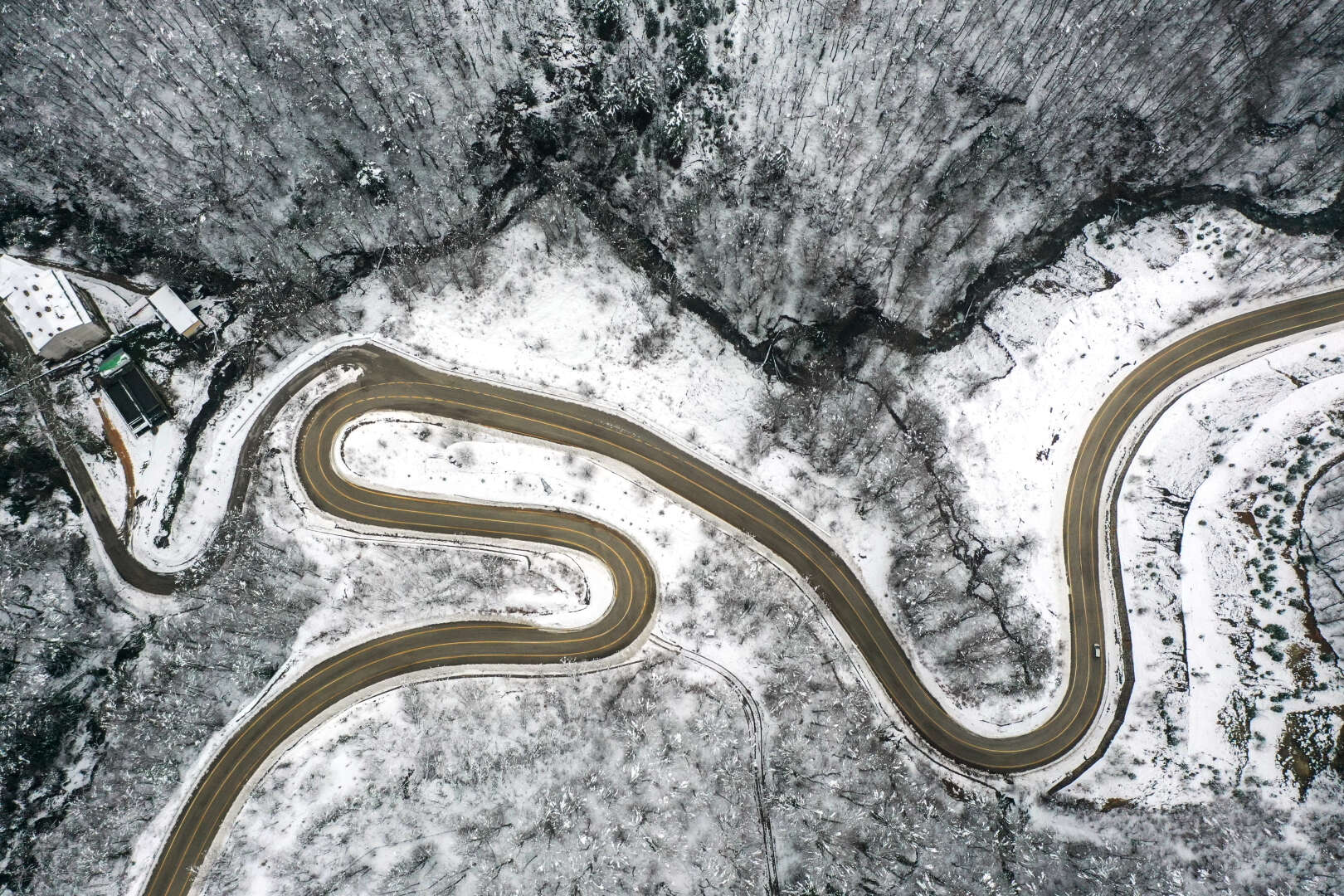 Ormanlık alanların içinden geçen Oylat Mağarası ve Oylat Kaplıcası'na giden ve karla bütünleşen kıvrımlı "S yolu" dronla görüntülendi.