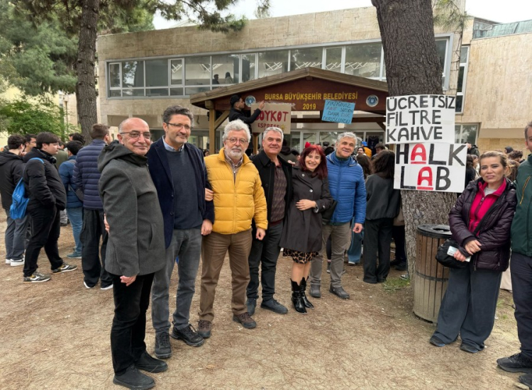 Bursa Uludağ Ünivetsitesi'nin Direnen Tıbbiyeliler'i "Adaletsizlikle doldurulan bir fincan, vicdanla yudumlanamaz" diyerek CHP'nin boykot listesindeki Espressolab'in yanında buluştu.